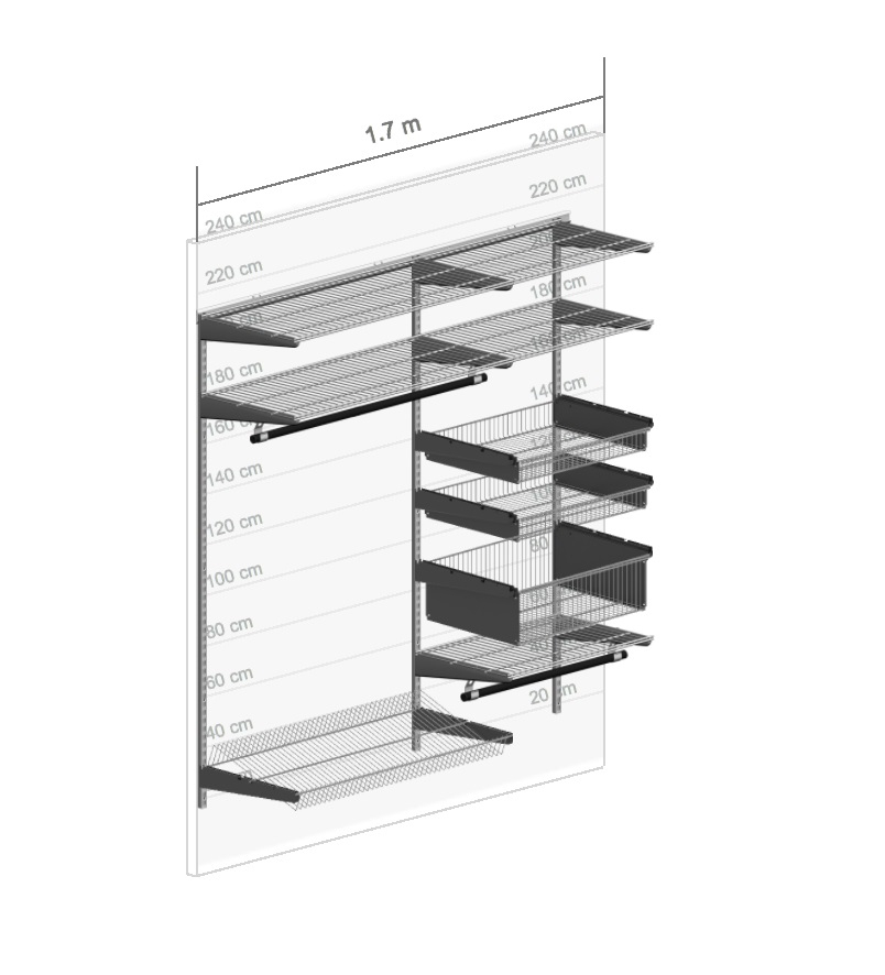 В комплект входят несущие рельсы и навесные направляющие, полки, штанги, аксессуары, крепежные элементы. Можно докупить множество дополнительных компонентов для гардеробной системы.