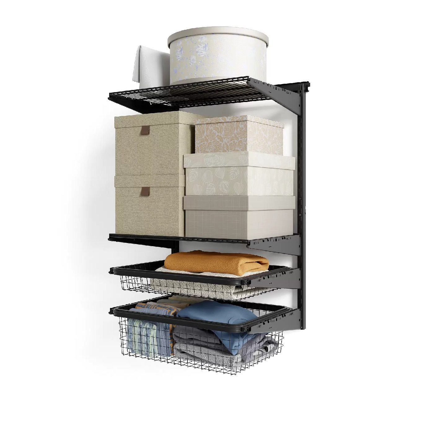 В комплект входят несущие рельсы и навесные направляющие, полки, штанги, аксессуары, крепежные элементы. Можно докупить множество дополнительных компонентов для гардеробной системы.