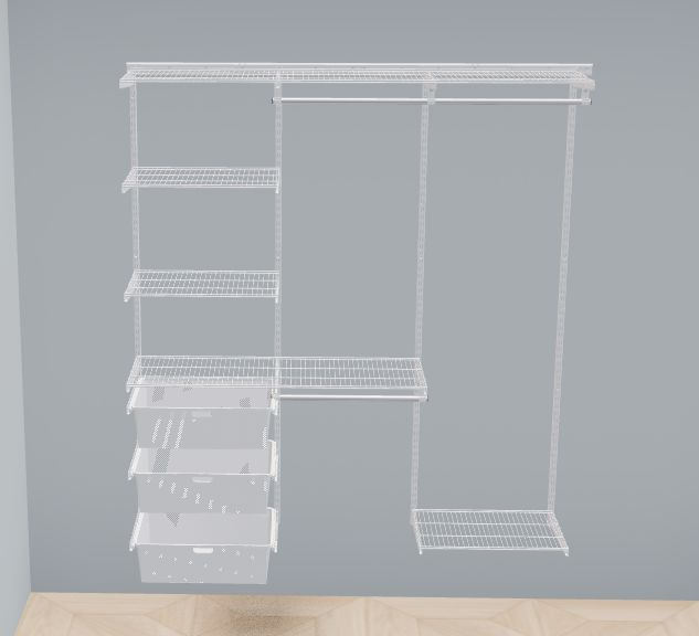В комплект входят несущие рельсы и навесные направляющие, полки, штанги, аксессуары, крепежные элементы. Можно докупить множество дополнительных компонентов для гардеробной системы.