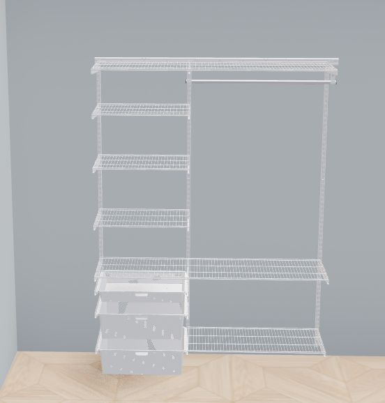 В комплект входят несущие рельсы и навесные направляющие, полки, штанги, аксессуары, крепежные элементы. Можно докупить множество дополнительных компонентов для гардеробной системы.
