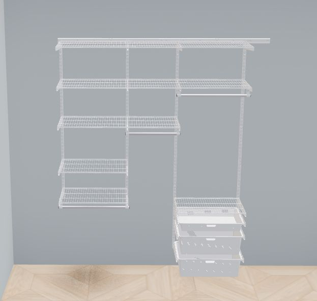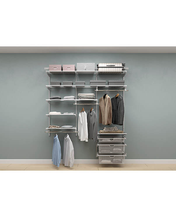В комплект входят несущие рельсы и навесные направляющие, полки, штанги, аксессуары, крепежные элементы. Можно докупить множество дополнительных компонентов для гардеробной системы.
