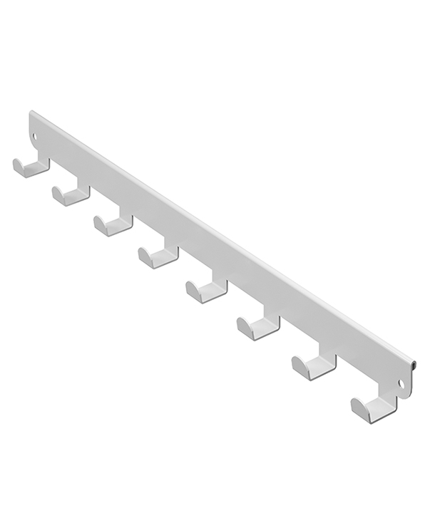 Крючки боковые представляют собой металлическую планку на 6 или 8 крючков (для кронштейнов глубиной 335 и 435 мм), которая навешивается на внешнюю боковую поверхность кронштейна в гардеробной системе ПРАКТИК Home.