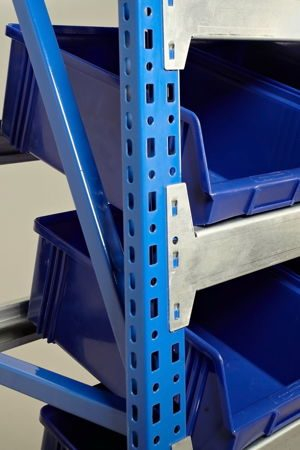 Безболтовое соединение. Технические особенности балок позволяют не использовать полки для расстановки пластиковых ящиков.