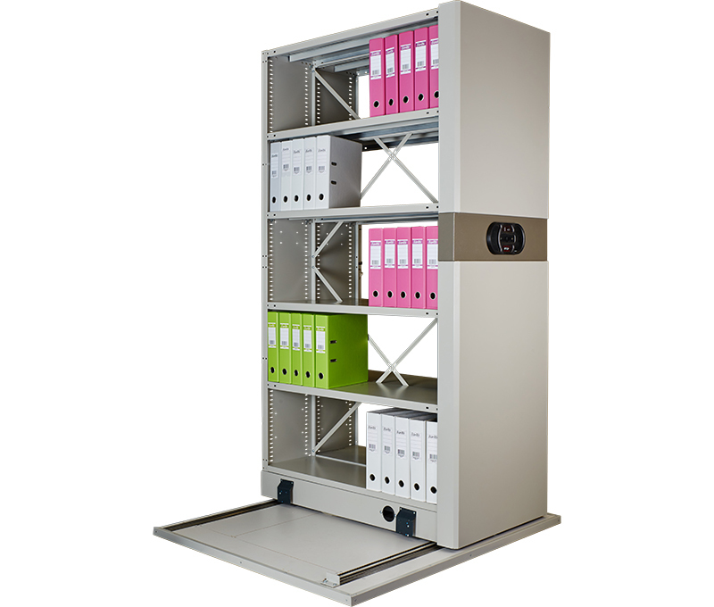 - использование электрического привода позволяет в не зависимости от веса хранимых документов перемещать стеллажи без усилий со стороны сотрудника работающего со стеллажной системой.