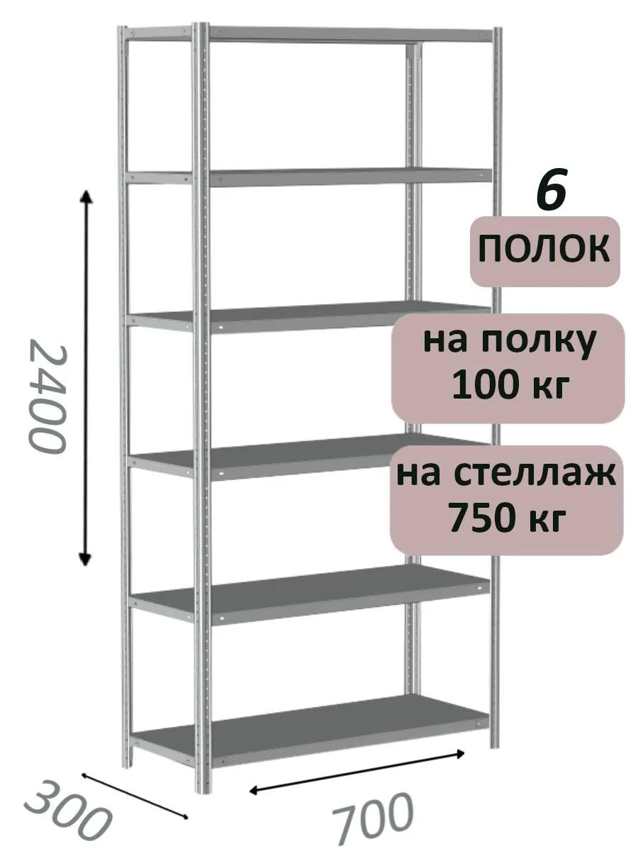 Стеллаж металлический полочный МС 2400х700х300, 6 полок, 100 кг на полку, светло-серый