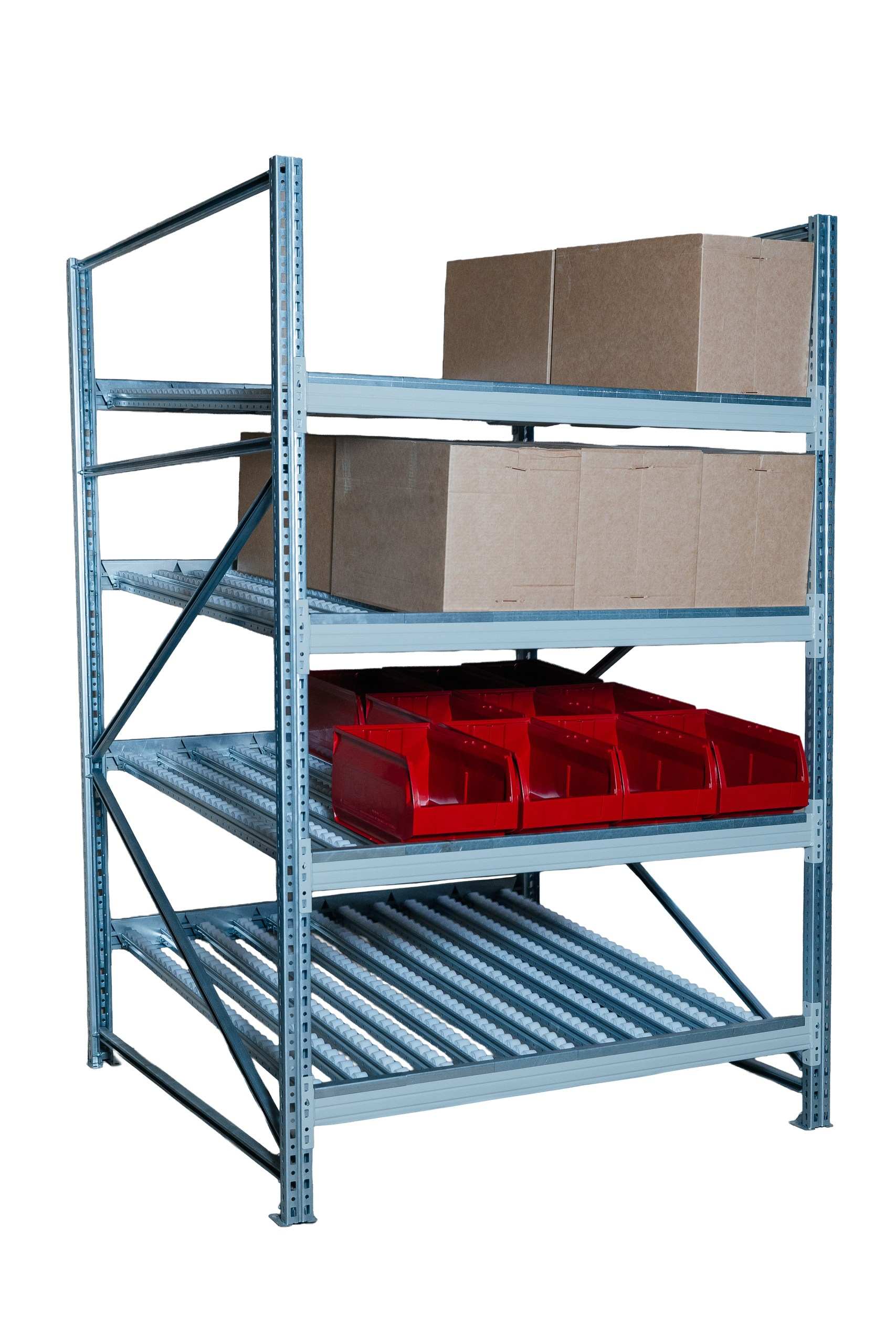 Гравитационный стеллаж с роликовыми полками 1600х1500х1300, 4 яруса