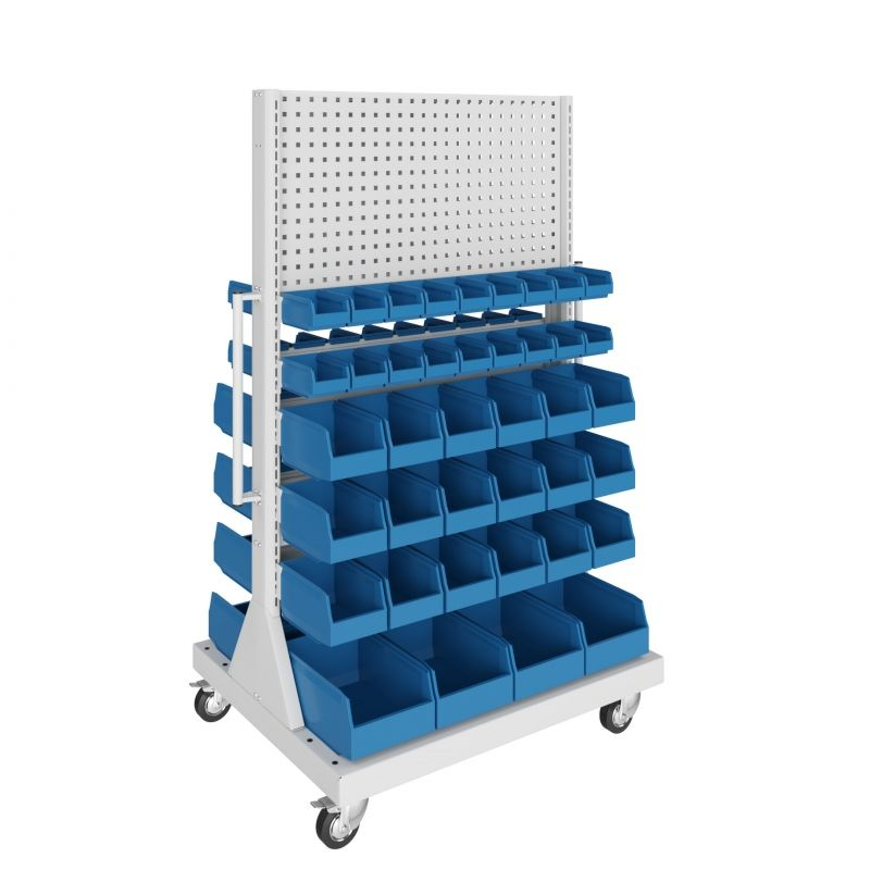 На 6 ярусах мобильной стойки размещаются пластиковые контейнеры трех типоразмеров.