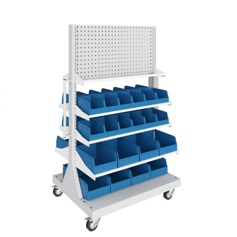 Комбинированная мобильная стойка с перфорированными панелями для инструментов и пластиковыми контейнерами для метизов, креплений и ЗИП.