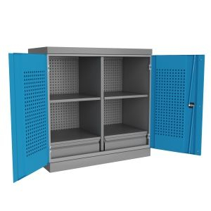Антресоли изготовлена из листовой стали и обеспечивает надежное запирание дверей ригельной системой. Шкаф данной модели может комплектоваться либо полками Technic(1) и ящиками Technic(1) – по всей ширине шкафа, при этом максимальное количество полок и ящиков по высоте - 12 штук. При установке перегородки, шкаф делится на две части и может комплектоваться полками Technic(2) и ящиками Technic(2), при этом максимальное количество полок и ящиков по высоте - 12 штук в два ряда.