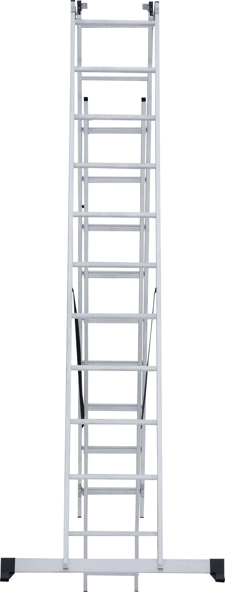 - Усиленная траверса с нескользящими башмаками из 2х-компонентного пластика с прорезиненной опорой (в комплекте поставки для лестниц 3×15–3×17).