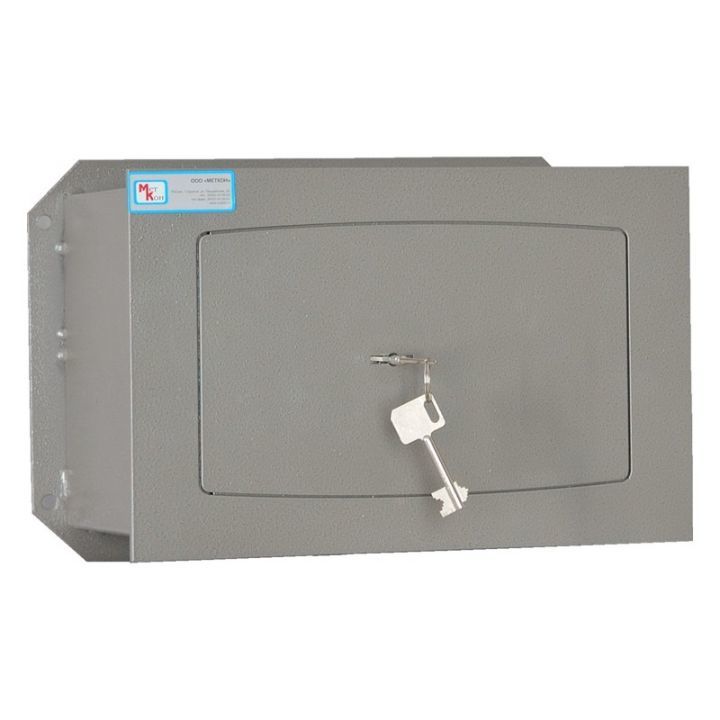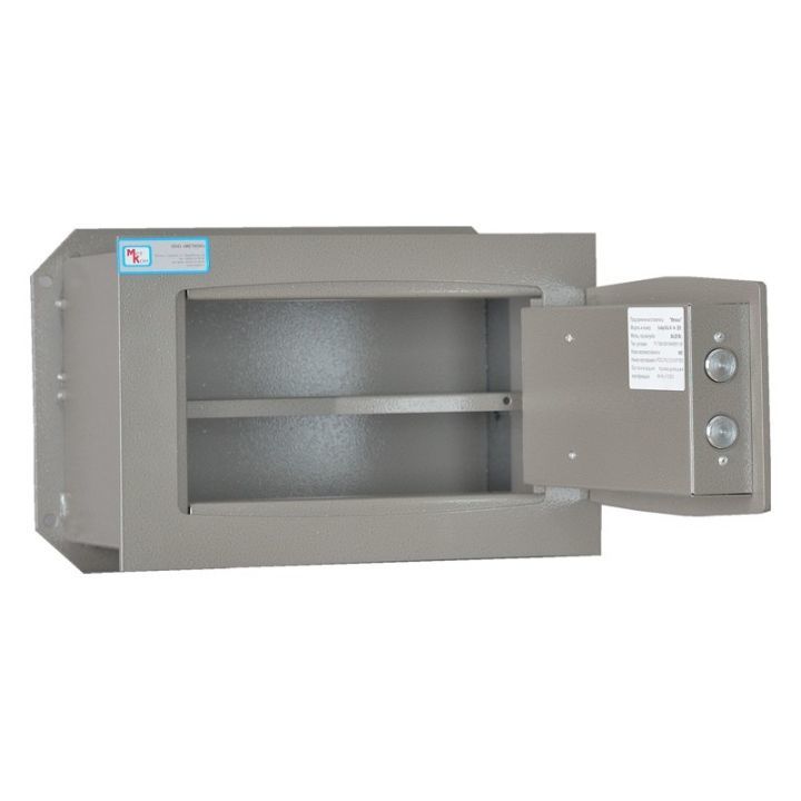 Дверь шкафа оснащена сейфовым замком сувальдного типа. Корпус сейфа толщиной 2 мм, лицевая панель и дверь толщиной 5 мм. На задней стенке корпуса расположены отверстия для крепления.