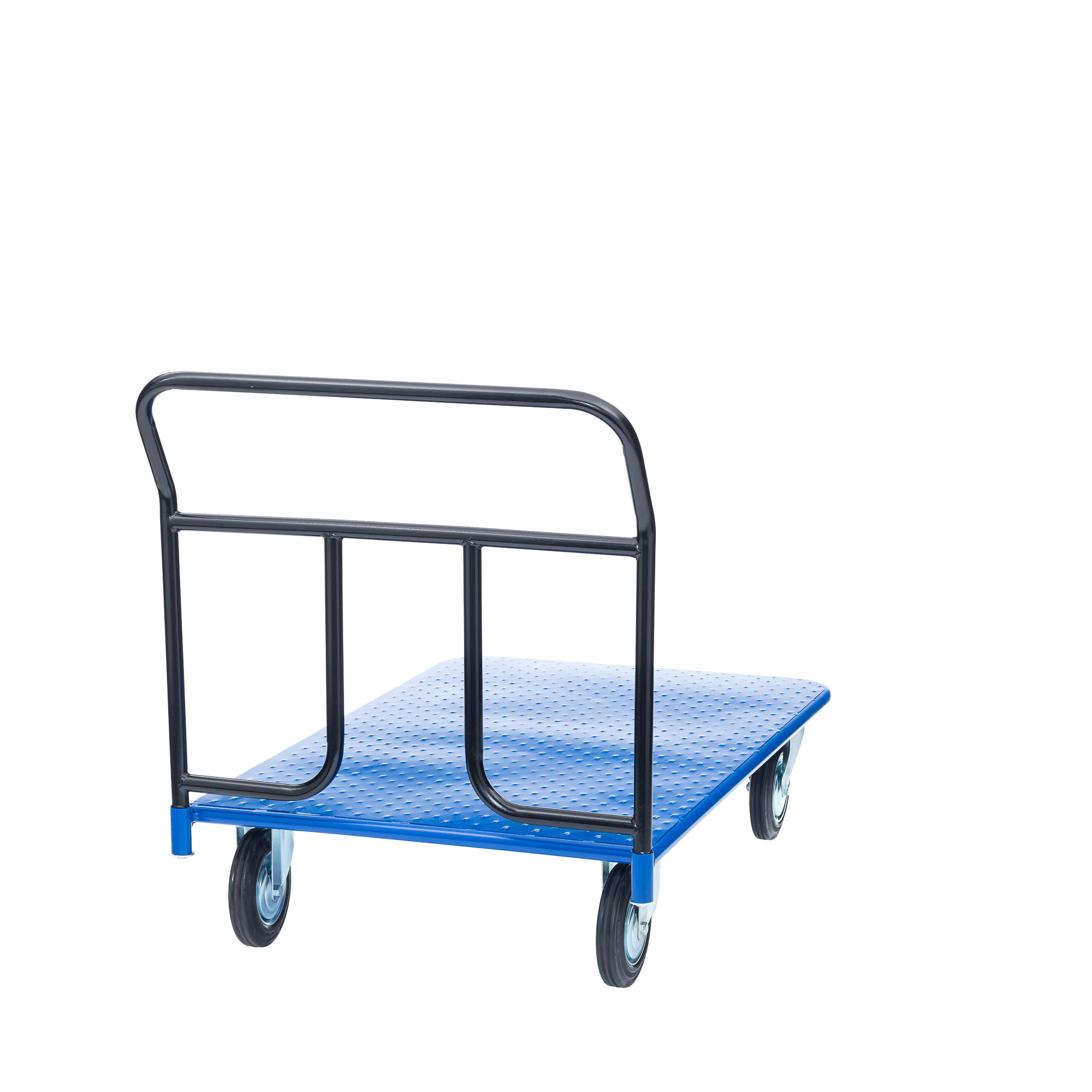 Платформенная 4-х колесная тележка КП-500 (800х1200) используется для перемещения различных грузов в складских помещениях. Ручка крепится к платформе болтами, для компактного хранения можно снять, высота ручки 750мм. Платформа имеет уникальную рельефную, полимерную, противоскользящую поверхность. Цвет синий, шагрень. Для легкого перемещения тележка КП-500 комплектуется 2 поворотными и 2 неповоротными колесами, изготовленными из высококачественной литой резины.